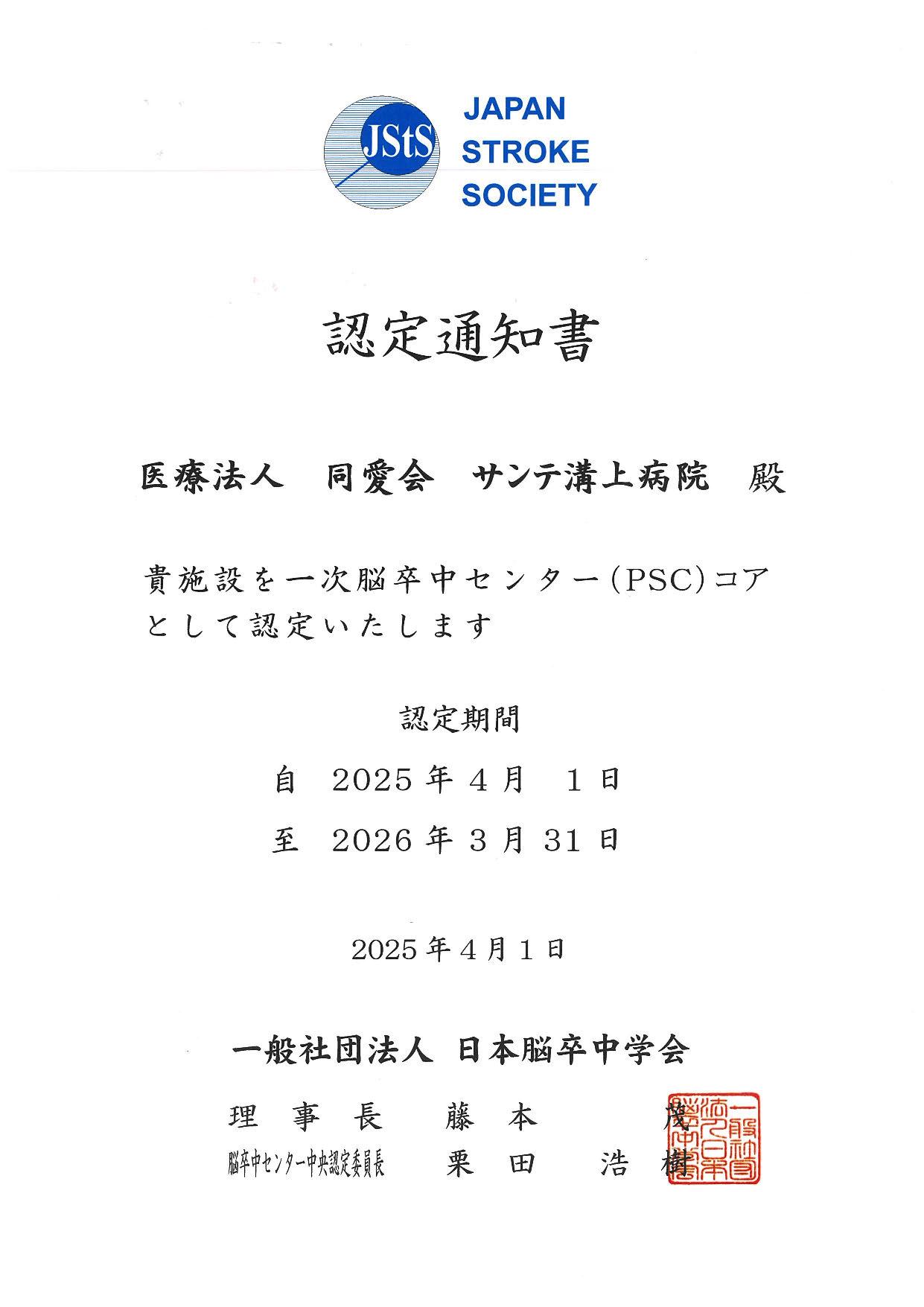 当院は認定基準をクリアし、2025年4月1日に日本脳卒中学会から認定を受けました。