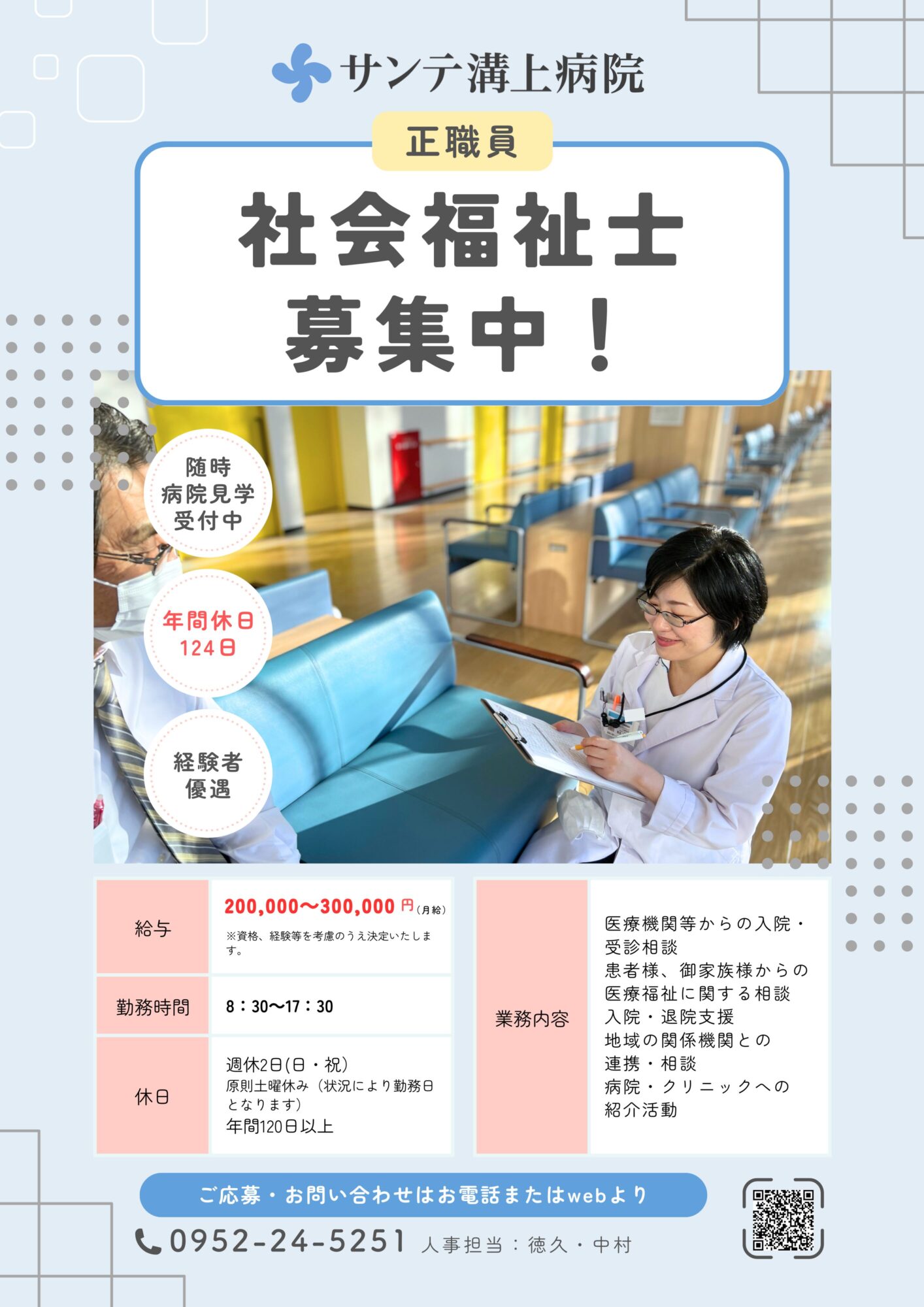 【採用情報】社会福祉士 2026.01.19 カテゴリー: サンテ溝上病院からのお知らせ タグ: MSW, 佐賀市, 医療ソーシャルワーカー, 採用情報, 求人, 病院, 社会福祉士, 職員募集 詳細は下記のリンクをご覧ください。 https://sante-mizokami.com/topics/recruit/#socialworker Share ツイート LINE