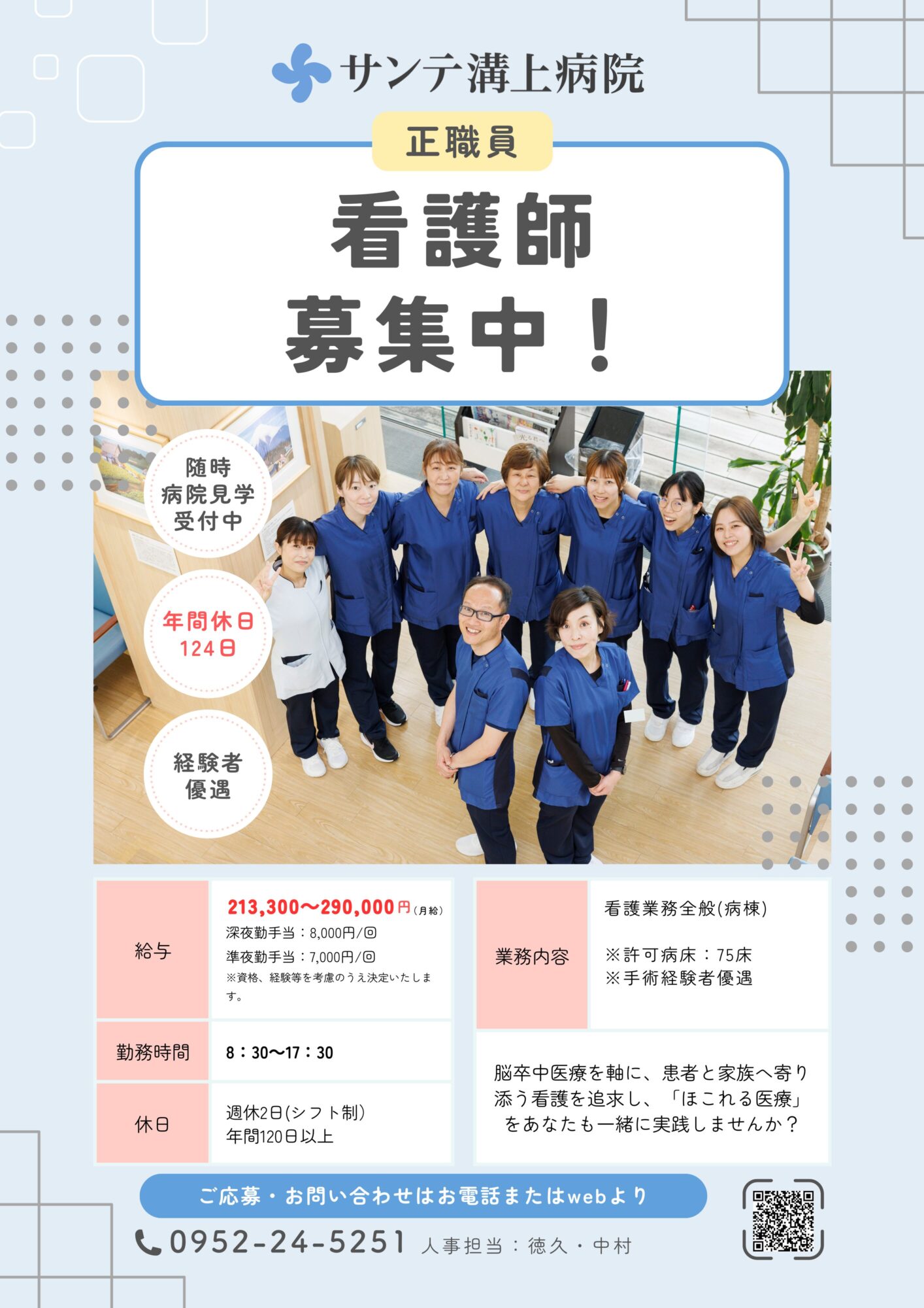 【採用情報】看護師 2026.01.19 カテゴリー: サンテ溝上病院からのお知らせ タグ: 佐賀市, 採用情報, 求人, 病院, 看護師, 職員募集 詳細は下記のリンクをご覧ください。 https://sante-mizokami.com/topics/recruit/#nurse Share ツイート LINE